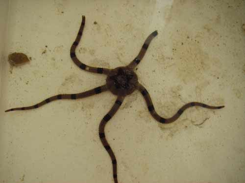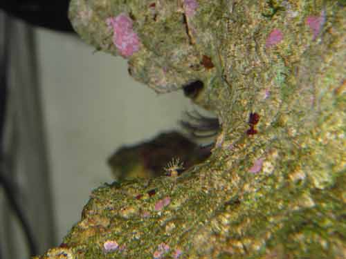 La une ophiure et une mini planquée dans les pierres. Elle complete l’equipe de detritivores qui nettoyent le bac.
